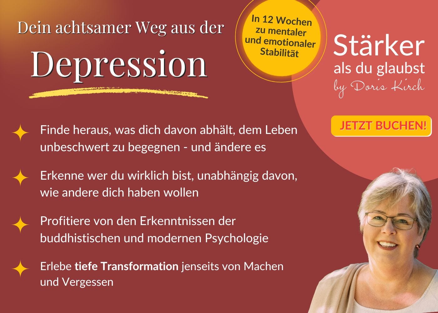 Wenn du lernst, dir selbst beim Denken zuzuschauen, erkennst du zunehmend die dysfunktionalen Denkmuster, die eine Depression gewöhnlich begleiten und aufrechterhalten. Dadurch kannst du deinem Denken eine andere, neue (depressionsfreie) Ausrichtung geben.